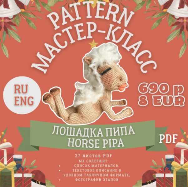 «Лошадка Пипа», именно так я назвала эту озорницу! Итак, описание растянулось аж на 27 листов)) в начале рассказываю о материалах, которые необходимы. Текстовое описание представлено в удобном табличном формате. Каждый шаг визуализирован фото. Описание на двух языках – русском и английском. Других, к сожалению, я не знаю. Поэтому только два) Размер у нашей лошадки такой: длина – 11,5 см., высота – 10 см.